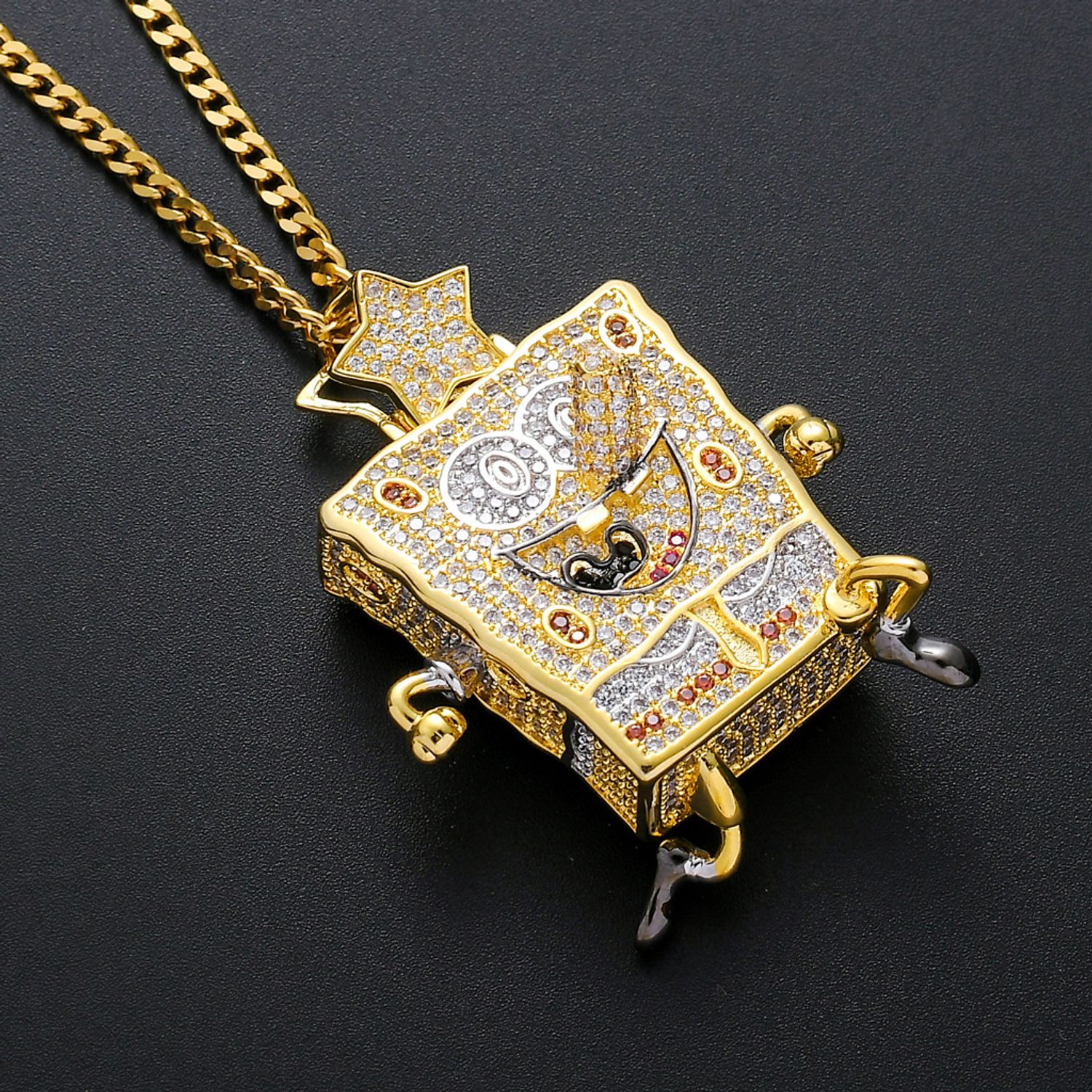 14K Gold Plated Iced Out Sponge Bob Pendant Necklace for Men Women