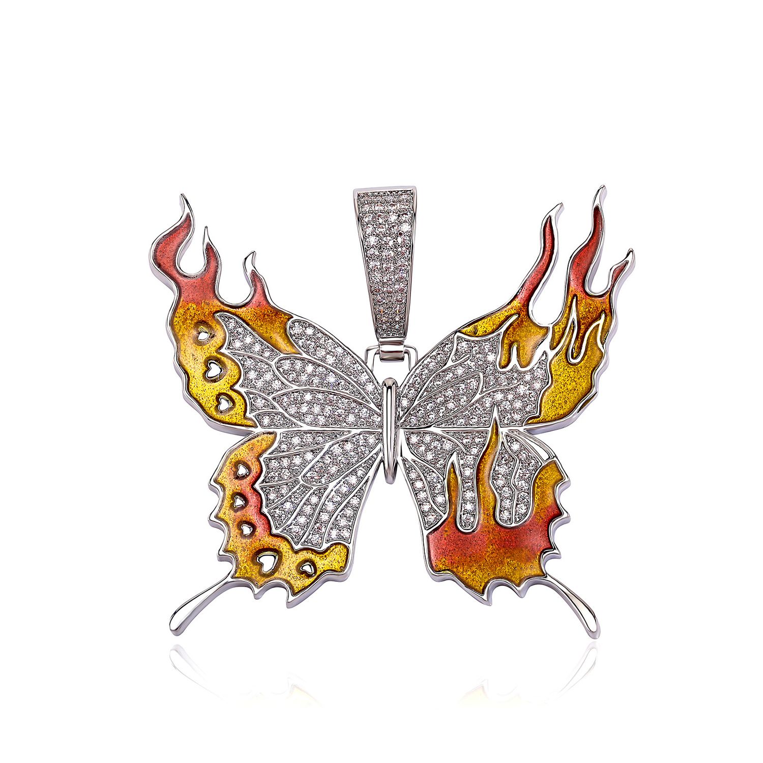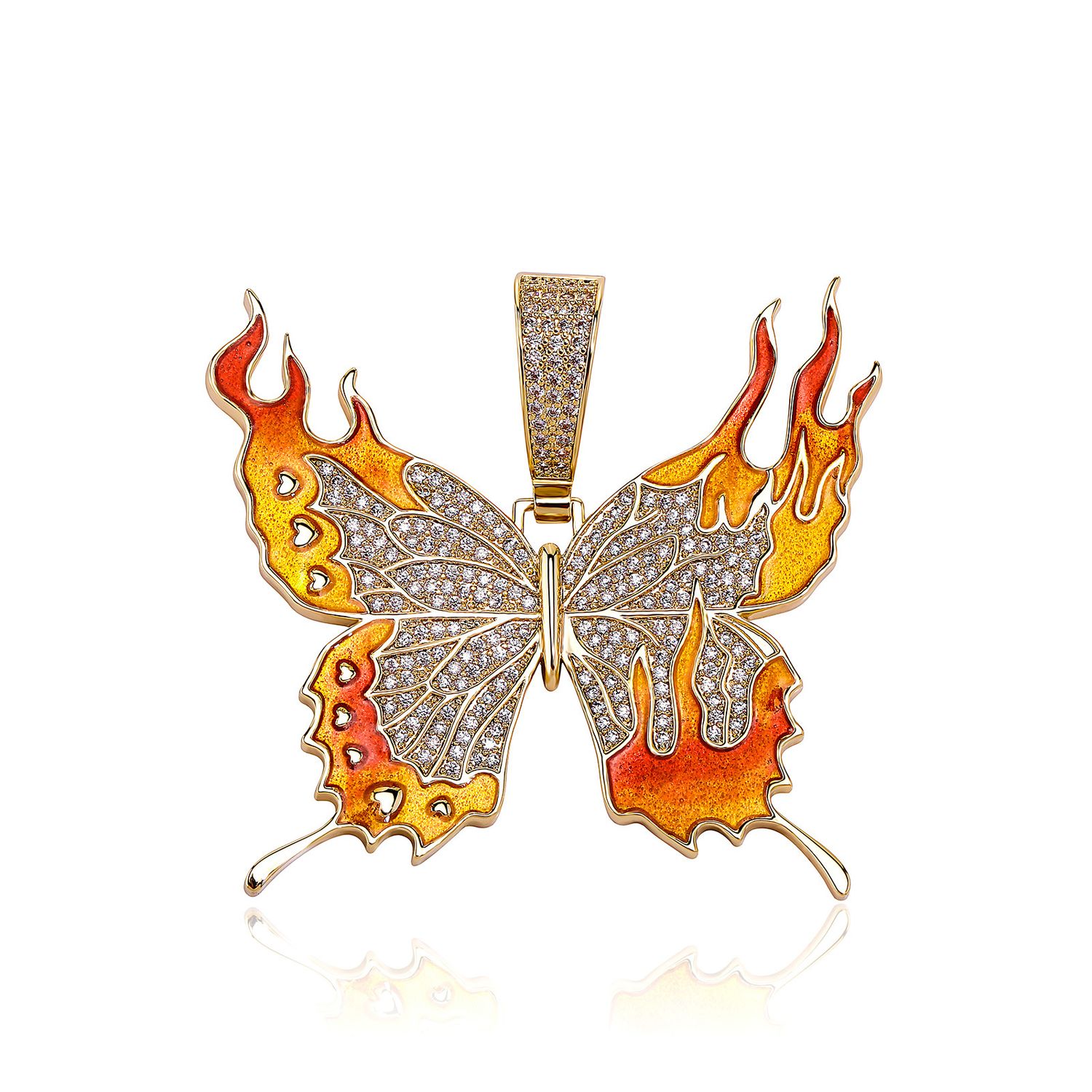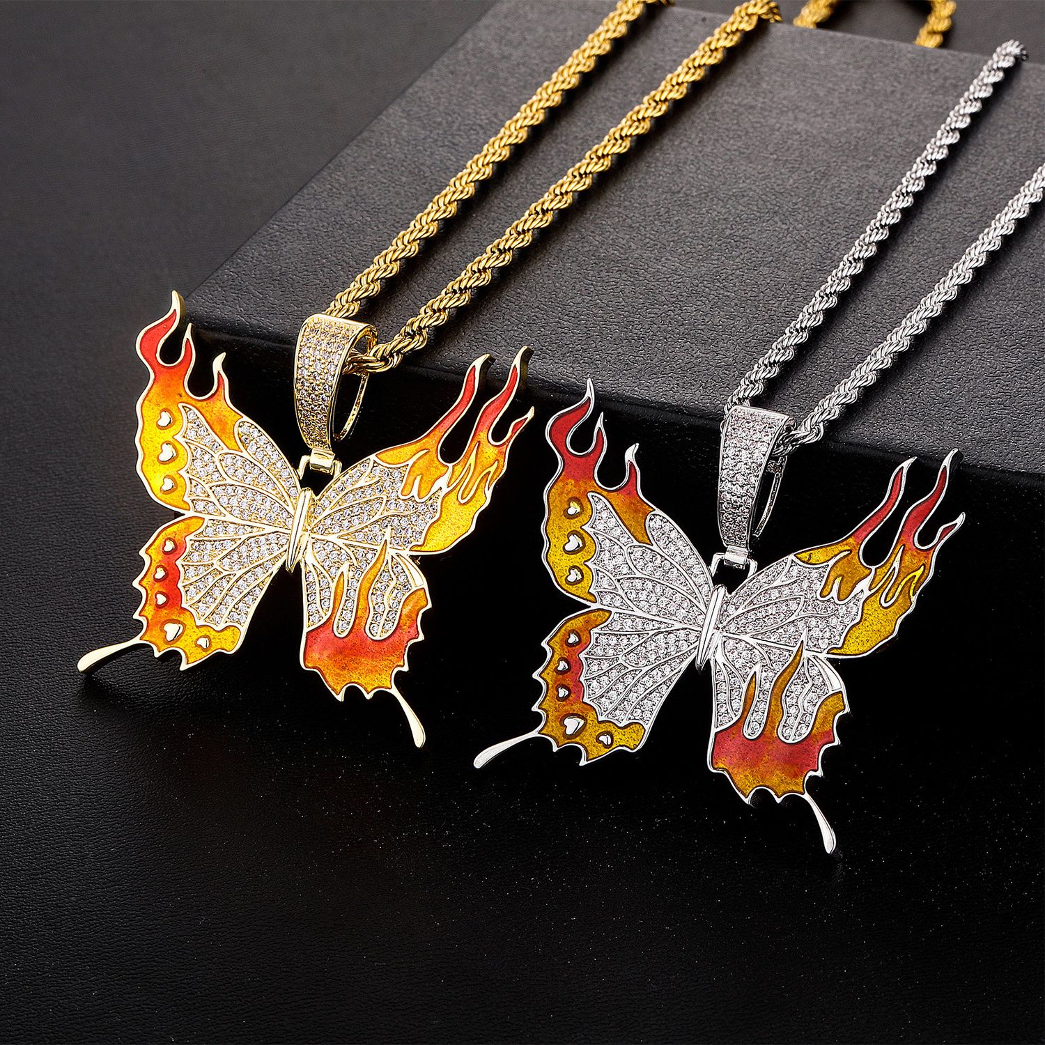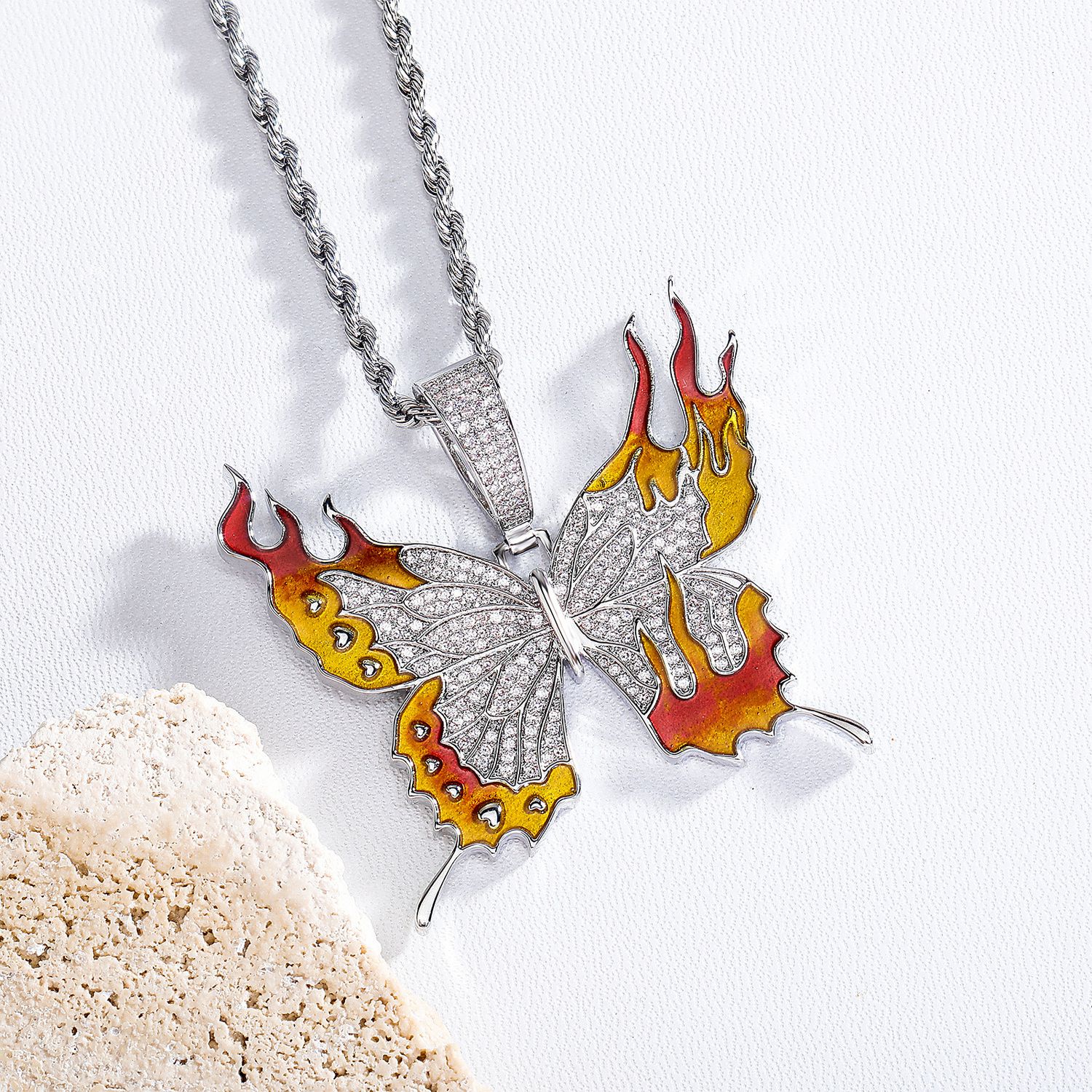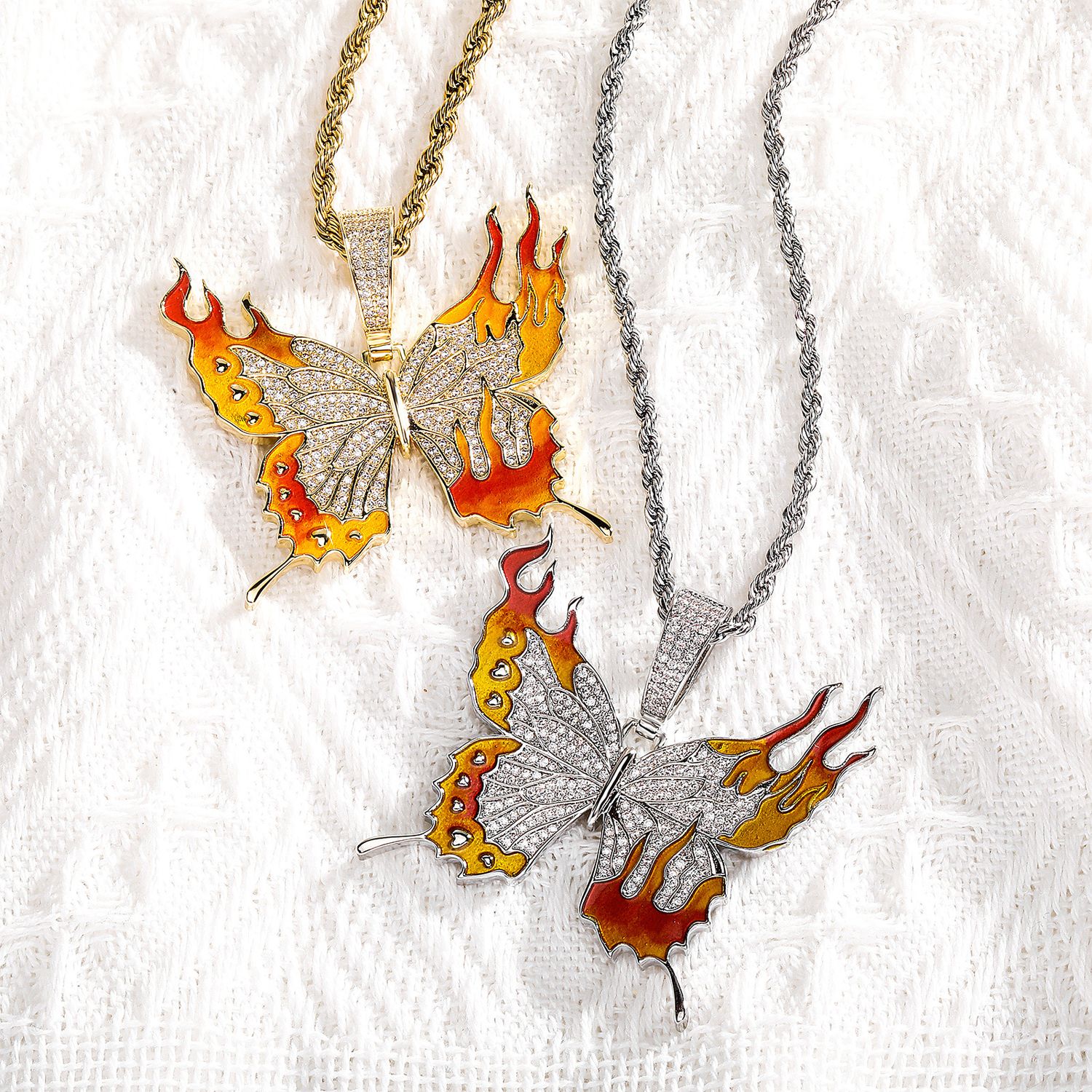 Iced Out Flaming Butterfly Pendant Necklace for Women Men